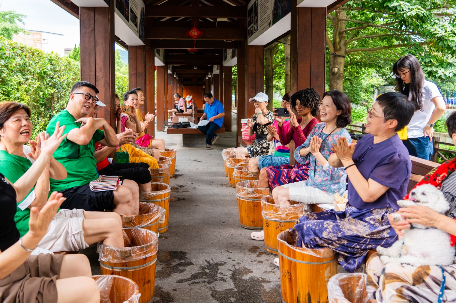站在溫湯古井旁,艾芙琳與來(lái)自上海、廣州等地的“新溫湯人”親切交流。這群長(zhǎng)期旅居的退休老人,每日在文化長(zhǎng)廊泡腳、唱歌,享受富硒溫泉帶來(lái)的健康生活。來(lái)自上海的退休教師王美華已在溫湯鎮(zhèn)旅居3年。她說(shuō):“我患有輕度關(guān)節(jié)炎,來(lái)這里泡溫泉半年后,疼痛明顯緩解?,F(xiàn)在每天和朋友們?cè)陂L(zhǎng)廊泡腳唱歌,生活愜意。” 艾芙琳與“新溫湯人”在一起唱歌。陳旅 攝