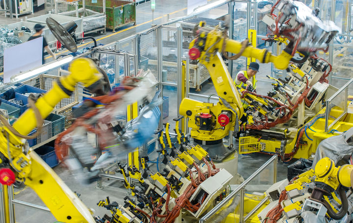 2025年10月9日,浙江省湖州市長興經(jīng)濟(jì)技術(shù)開發(fā)區(qū)的長興地通汽車部件有限公司技術(shù)人員操控工業(yè)機(jī)器人生產(chǎn)新能源汽車配件(無人機(jī)照片)。新華社發(fā)(譚云俸攝)