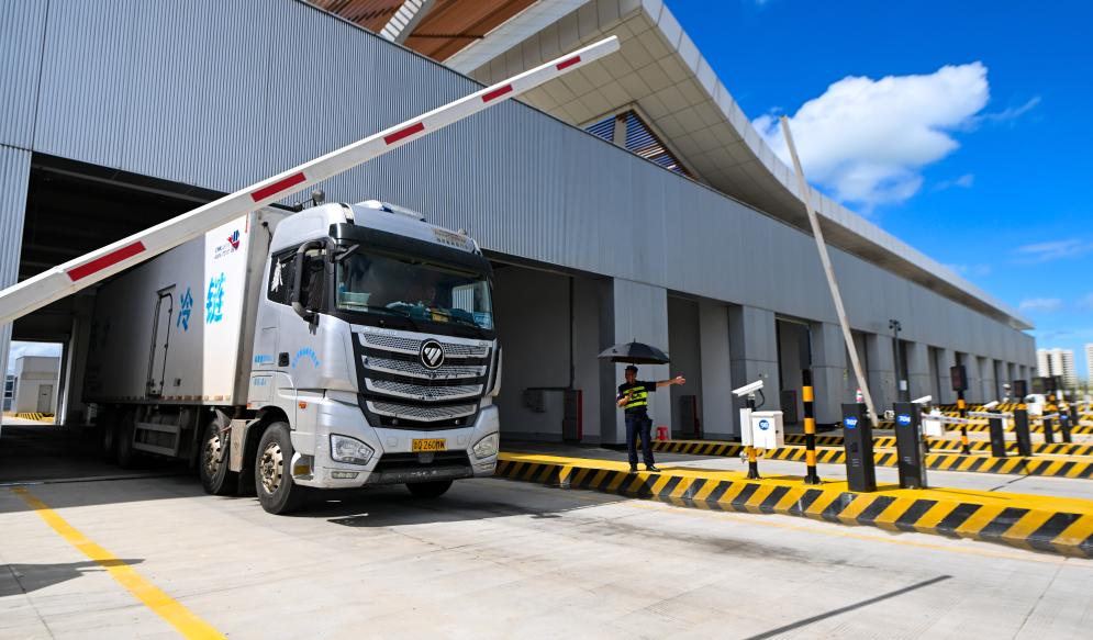 2025年9月17日,離島貨車通過(guò)??谛潞8酆湍细?ldquo;二線口岸”(貨運(yùn))集中查驗(yàn)場(chǎng),開(kāi)往港區(qū)。新華社記者 楊冠宇 攝