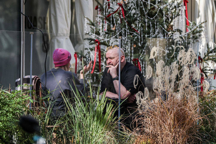 1月13日,兩名外國人在上海市華山路街頭的外擺位上交流。新華社記者 丁汀攝