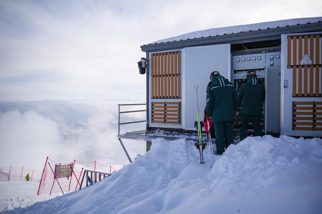 齊凡和哈依沙爾帶著雪具乘纜車抵達海拔2800米的云霄峰頂,這里是高級雪道的起點,也是電力保障的重中之重。