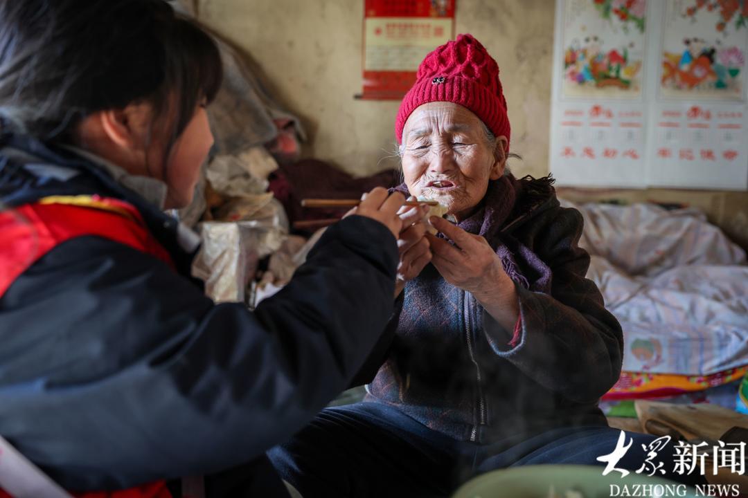 小志愿者劉梓瑜陪李元花吃餃子“過小年”。