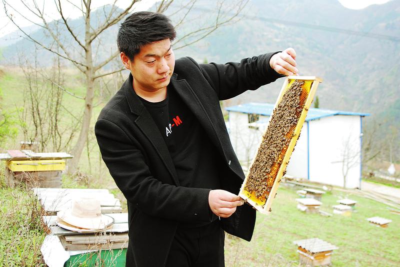 四月的商洛大地,披綠戴紅,春意盎然。中流村的山坡上、田野里整齊地?cái)[放著一個(gè)個(gè)小木箱,為春日增添了一道特殊的風(fēng)景。那小小的蜂箱里裝著的中華蜂是李海亮的寶貝。與蜂初識(shí),李海亮便一見“傾心”。為了養(yǎng)蜂,他甘愿放棄城市里月薪過(guò)萬(wàn)元的總經(jīng)理工作,毅然回鄉(xiāng)當(dāng)起了蜂農(nóng),開啟了“甜蜜”事業(yè)。