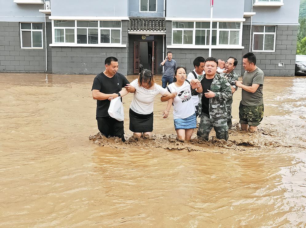 7月23 日,暴雨使洛南縣靈口鎮(zhèn)移民安置點(diǎn)被淹。當(dāng)?shù)攸h委、政府緊急組織災(zāi)民轉(zhuǎn)移到安全地域。