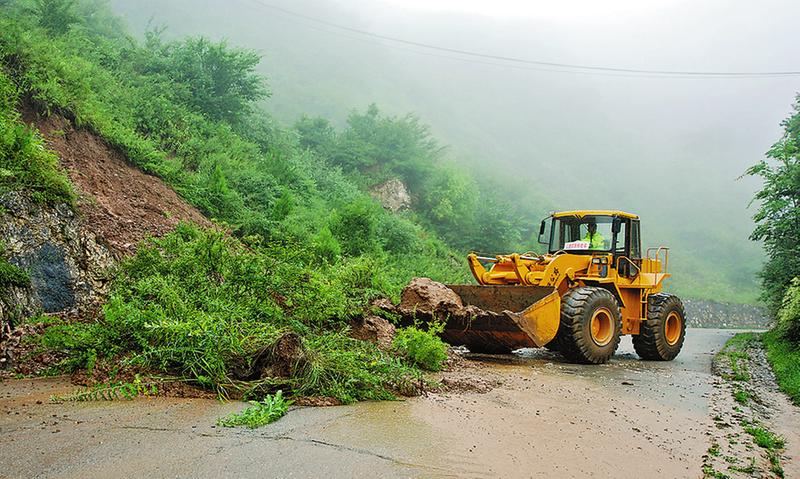7月23 日,S101 省道秦嶺頂處,商州公路管理段工作人員駕駛鏟車清理路面。