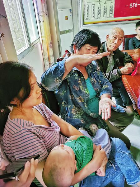 7月23 日,山陽(yáng)縣天竺山鎮(zhèn)僧道關(guān)村臨時(shí)安置點(diǎn)內(nèi),曹家坪組村民比畫著家里的水有多深。