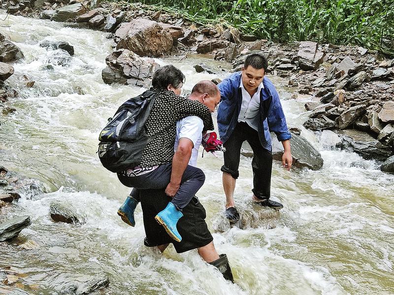 7月23 日,山陽(yáng)縣高壩店鎮(zhèn)高壩街社區(qū)工作人員正在轉(zhuǎn)移受災(zāi)群眾。