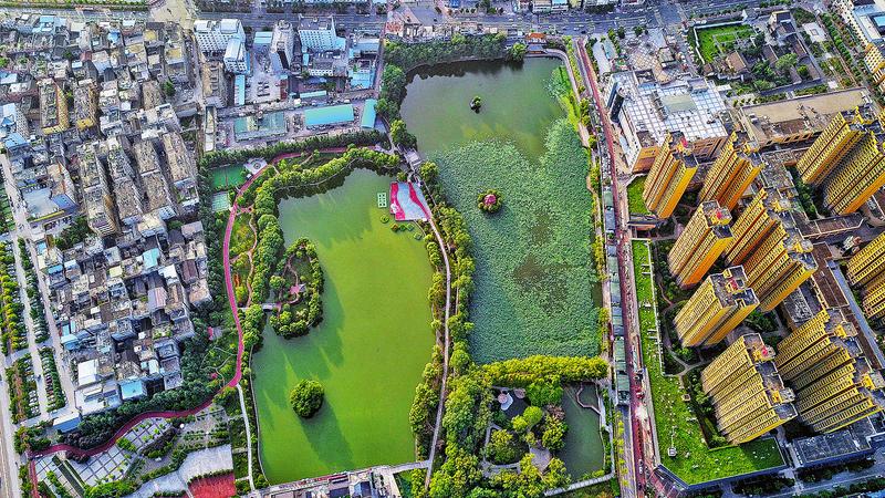 蓮湖公園猶如一塊碧玉鑲嵌在城區(qū)的中央,也被稱之為城市“綠肺”。經(jīng)過擴(kuò)建后的蓮湖公園總面積達(dá)到197.7畝,其中水域面積114.7畝,綠化面積52畝,形成了南湖、北湖兩大板塊,分為入口廣場、湖面水域、健身場地、古城墻展示、休閑綠地、商業(yè)步行街等六個功能區(qū),成為市區(qū)內(nèi)集旅游觀光、商業(yè)、休閑娛樂、歷史人文等多功能為一體的綜合性生態(tài)公園。圖為8月14日,記者航拍的蓮湖公園全景。(記者楊鑫攝)
