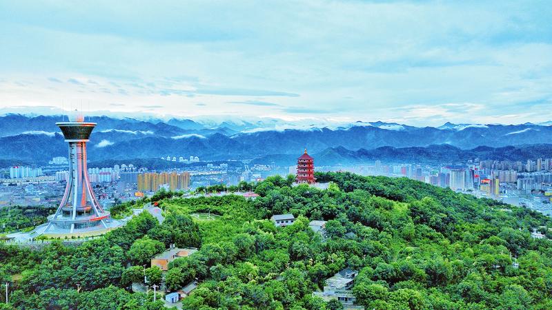 從商洛城區(qū)向北眺望,在郁郁蔥蔥的山林簇?fù)碇校瘌P山公園若隱若現(xiàn)。