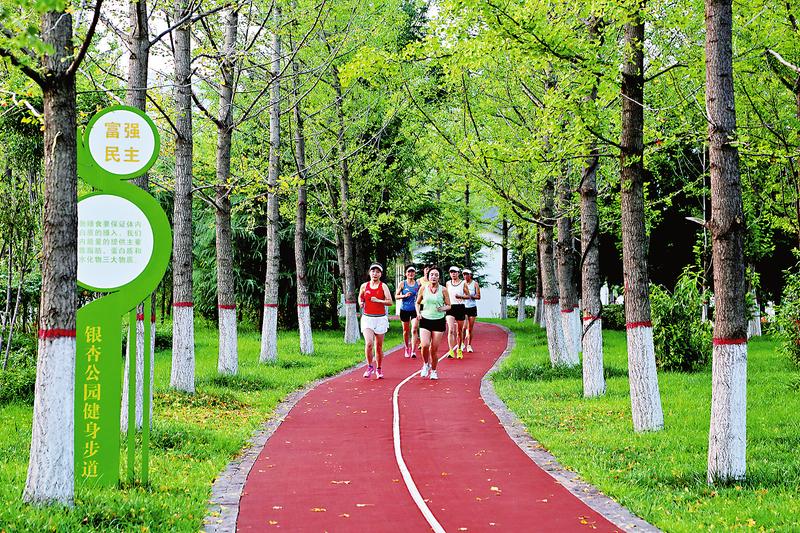 清晨和傍晚的市區(qū)銀杏公園內(nèi),慢跑愛好者們結(jié)伴在林間慢跑,盡顯運(yùn)動活力。市民悠閑散步,孩童林下嬉戲,一派和諧、幸福的景象。銀杏公園位于市區(qū)丹江南岸,東起丹江立交橋,西至丹江構(gòu)峪橋與312國道交匯處,南鄰商鞅大道,北至丹江河堤,與丹江北岸的丹江公園隔江相望,東西向長3300米,呈帶狀布局,總面積為12.23萬平方米,綠化率達(dá)68.4%。2018年7月,銀杏公園內(nèi)鋪設(shè)完塑膠健身步道,更有利于提升廣大市民在運(yùn)動鍛煉時的舒適度和安全度。圖為8月15日,記者拍攝的銀杏公園塑膠健身步道一角。(記者 楊鑫 攝)