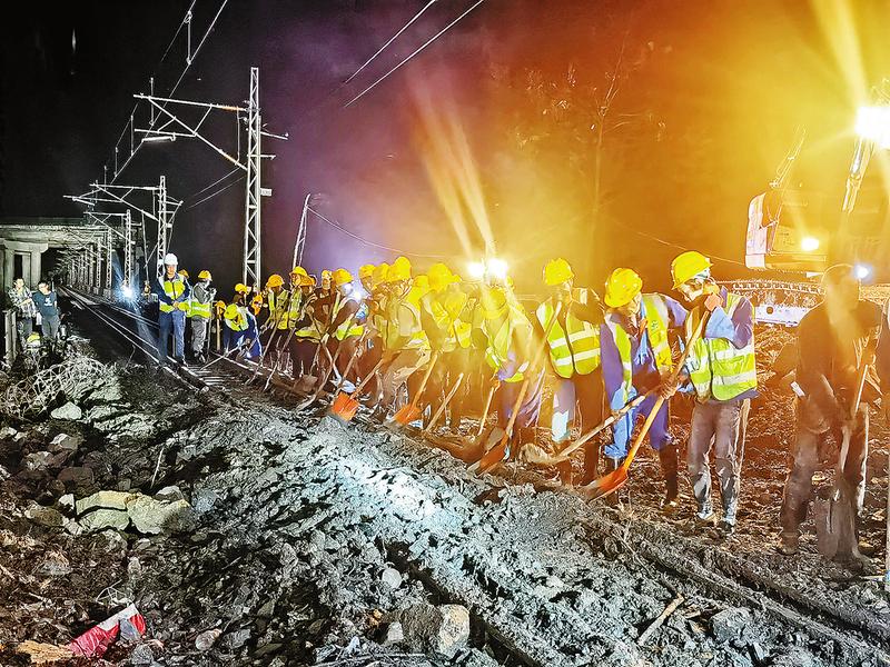 救急如救火。面對(duì)滑塌下來(lái)的270多立方米泥土和石塊,搶險(xiǎn)人員和鐵路工務(wù)部門(mén)決定采用人工配合挖掘機(jī)的方式清理坍塌土石方。他們一邊用鐵鎬與鐵鍬奮力清理鋼軌及隧道頂上的土石,一邊安排專職安全員對(duì)現(xiàn)場(chǎng)滑塌山體進(jìn)行觀察防護(hù)。經(jīng)過(guò)7個(gè)多小時(shí)的艱苦奮戰(zhàn),于當(dāng)晚11時(shí),塌方清運(yùn)完成,險(xiǎn)情排除,搶險(xiǎn)任務(wù)圓滿完成并順利通車(chē)。共計(jì)參與搶險(xiǎn)人員150多名,投入挖掘機(jī)3臺(tái)、吊車(chē)2臺(tái)、裝載機(jī)1臺(tái)。