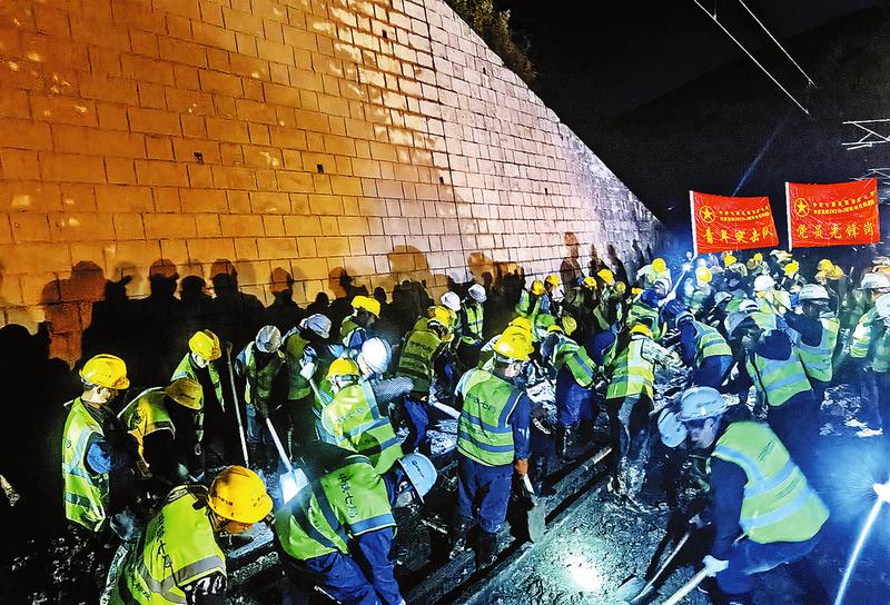 本報(bào)訊(汪子涵)9月28日,受持續(xù)強(qiáng)降雨影響,西康鐵路鎮(zhèn)安縣回龍鎮(zhèn)柏樹(shù)坪隧道進(jìn)口處山體出現(xiàn)滑坡塌方,造成營(yíng)業(yè)線中斷,情況十分緊急。險(xiǎn)情就是命令,中鐵七局西康高鐵3標(biāo)項(xiàng)目部接到消息后,第一時(shí)間組織人員、設(shè)備趕赴現(xiàn)場(chǎng),全力配合西安鐵路局安康工務(wù)段及柞水工務(wù)段對(duì)線路及隧道洞頂塌方進(jìn)行除險(xiǎn)清除。