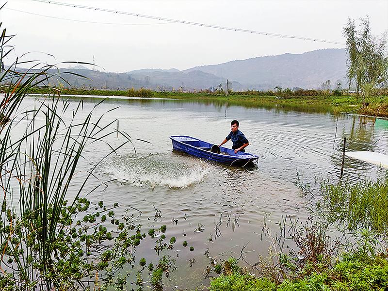 郭海燕在蝦塘投飼料