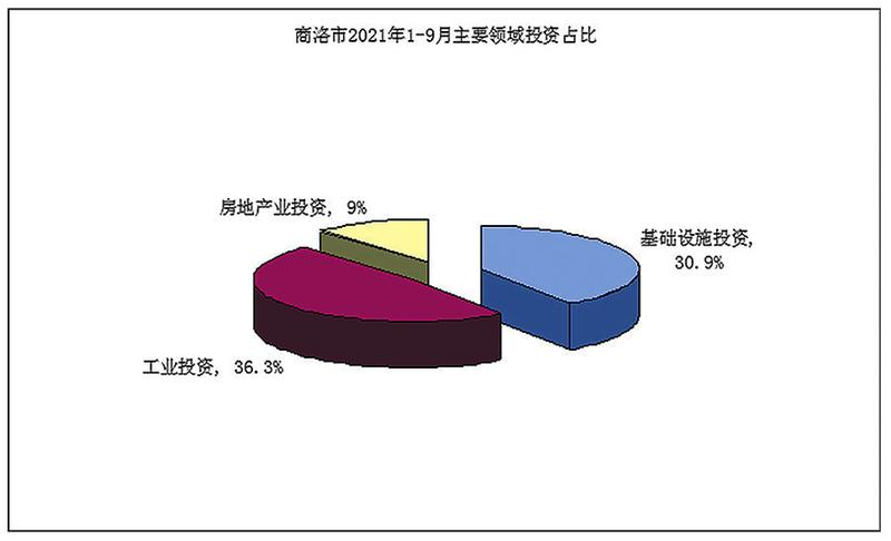 主要領域投資結構合理,房地產業(yè)投資占比下降。2021年1-9月,我市投資主要投向工業(yè)、基礎設施和房地產業(yè),分別占固定資產投資的36.3%、30.9%、9%,同比增長分別為-3.8%、3.7%、-2.5%。工業(yè)投資快速增長,成為投資第一大行業(yè);基礎設施在2020年斷崖式下跌后,2021年快速回升,降幅比去年同期回升了26.7個百分點,占比回升3.7個百分點。房地產業(yè)在經(jīng)過陜南移民大搬遷和大規(guī)模的棚戶區(qū)改造后,占比和增速持續(xù)回落,占比較去年同期回落2.5個百分點,增速回落5.9個百分點。
