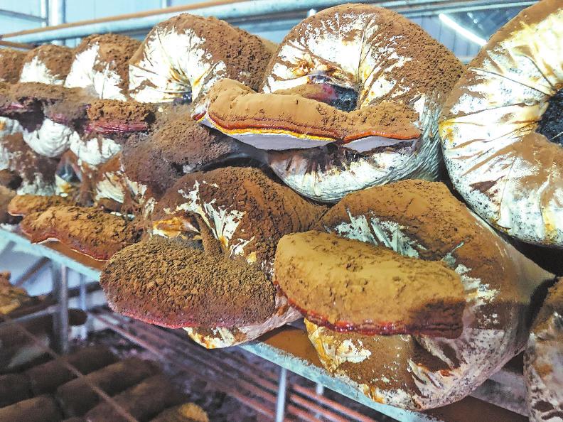 王智遠的富硒食用菌基地大棚里暖意融融,一株株大小各異、形態(tài)萬千的富硒靈芝長勢喜人,每一株富硒靈芝上面都長著一層厚厚的褐紅色的粉末,工作人員輕輕用刷子掃下表面的“粉末”進行收集。