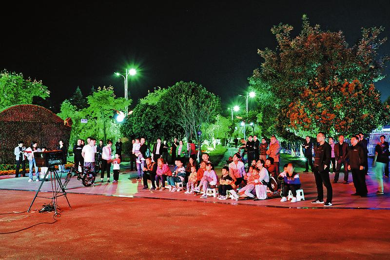 9月30日傍晚,在商州區(qū)大荊鎮(zhèn)移民搬遷安置點(diǎn)的小廣場(chǎng)上,放映員王熊正在忙碌地安裝放映設(shè)備,只見他熟練地?fù)纹鸶叽蟮闹Ъ?,和同事一起迅速地架起幕布。調(diào)試好設(shè)備,他開始播放音樂,營(yíng)造熱鬧的氛圍,吸引周邊群眾前來觀賞。雖然離電影開場(chǎng)還有半個(gè)小時(shí),但小廣場(chǎng)上已。擠滿了等候的群眾。晚上7點(diǎn)整,電影《紅線2017》在小廣場(chǎng)的大銀幕上正式上映,或坐或站的群眾看得津津有味。