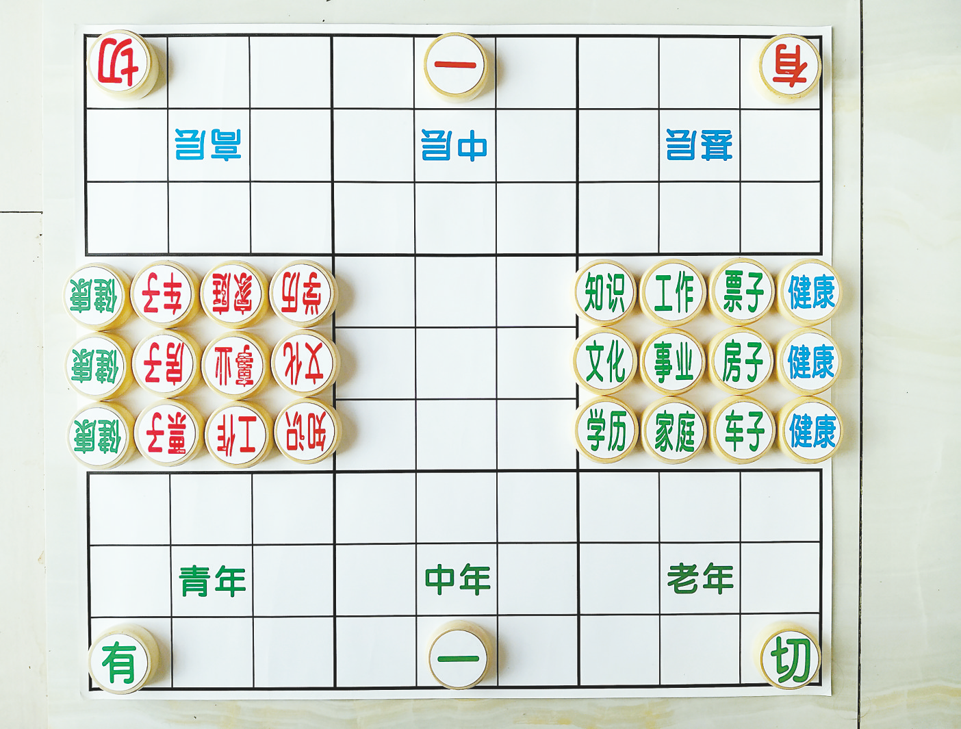 雙方每人15個(gè)圓形木塊棋子,棋子上下平面上的內(nèi)容分別是;勤學(xué)、勤學(xué)、勤學(xué),背面對(duì)應(yīng)的是知識(shí)、文化、學(xué)歷;勤奮、勤奮、勤奮,背面是工作、家庭、事業(yè);勤勞(勤懇)、勤勞(勤懇)、勤勞(勤懇),背面是票子、房子、車子。一方有重要、重要、重要,背面是健康、健康、健康;另一方有關(guān)鍵、關(guān)鍵、關(guān)鍵,背面是平安、平安、平安。另外,每人還有3個(gè)棋子,分別是“有”“一”“切”。