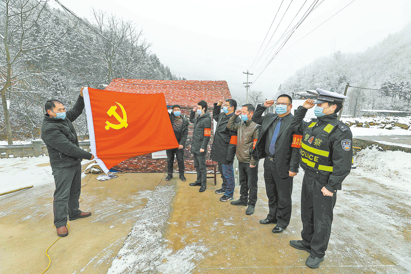 丹鳳縣巒莊鎮(zhèn)疫情防控檢查站工作人員重溫入黨誓詞(張釘民 攝)