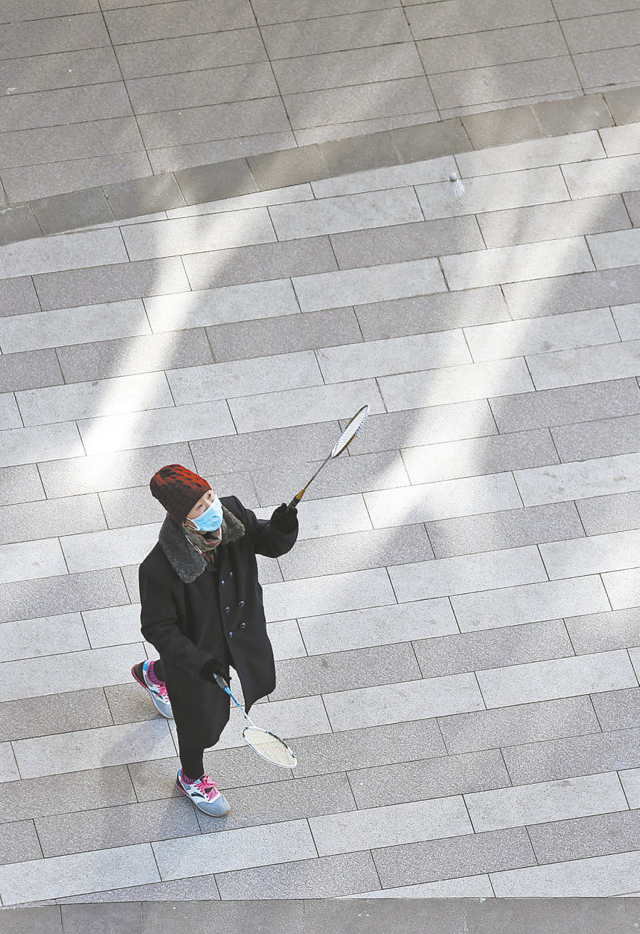 居民小區(qū)一個人的羽毛球“雙打”(方立攝)