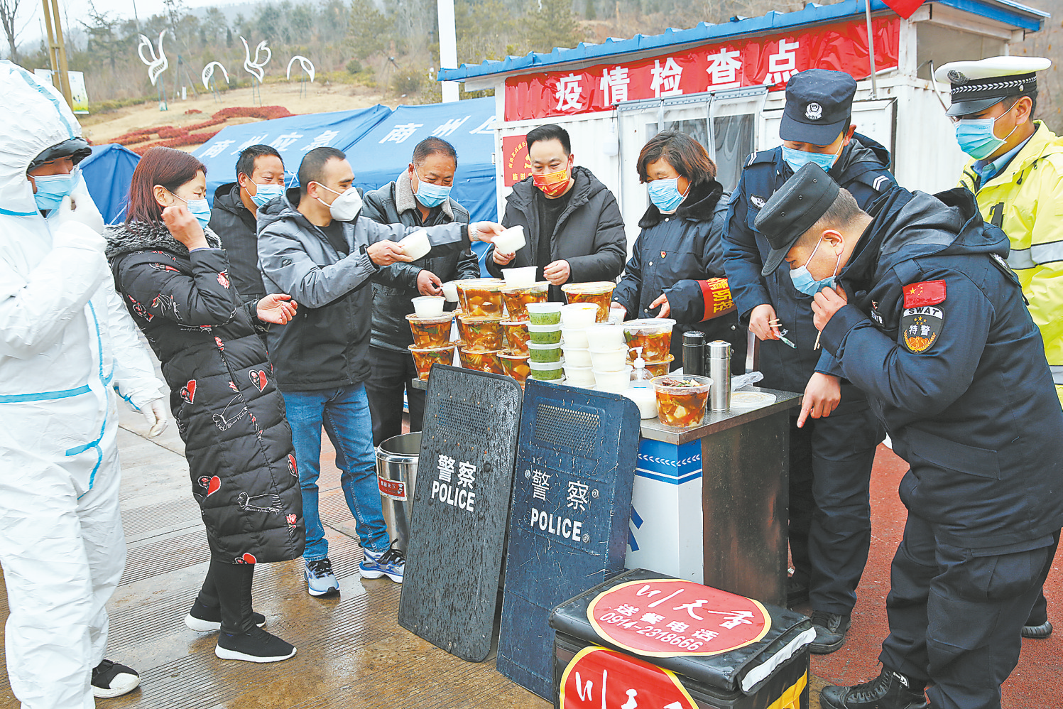一餐飲公司為商洛西、商洛北高速公路疫情防控檢查點的一線防疫人員免費提供午餐及晚餐。 (郝軍霞 攝)