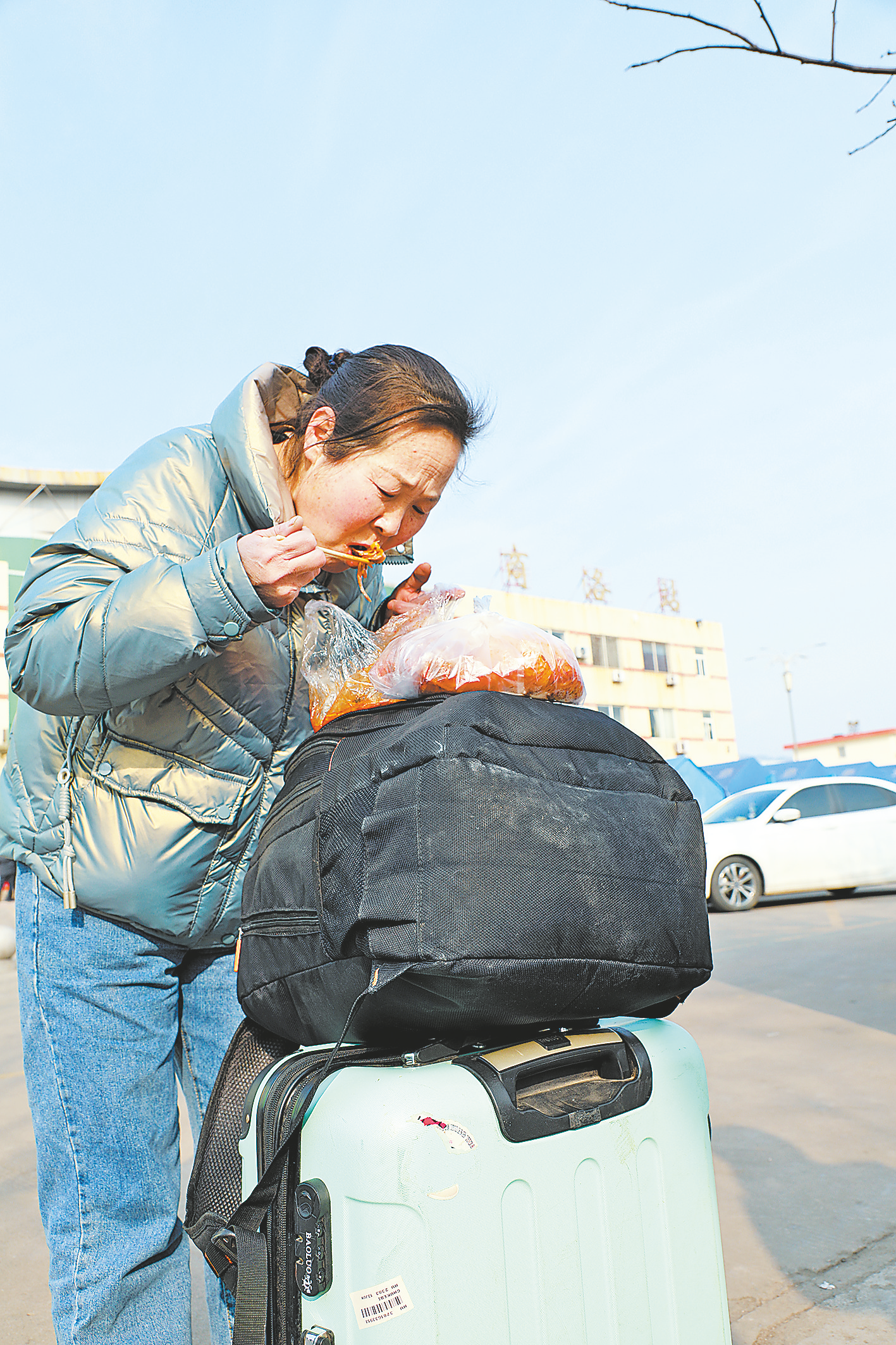 2月11日,是張俊霞決定動身的日子。前一天晚上,她把買的炸果子、豆腐干、柿餅分成了兩份,給自己帶上一份,給女兒裝上一份。行李箱已經(jīng)裝滿了,可她依然不想放棄任何一件,來來回回取出來又放進(jìn)去,試著擠出更多空間。最終,兩個(gè)行李箱塞得滿滿當(dāng)當(dāng)。