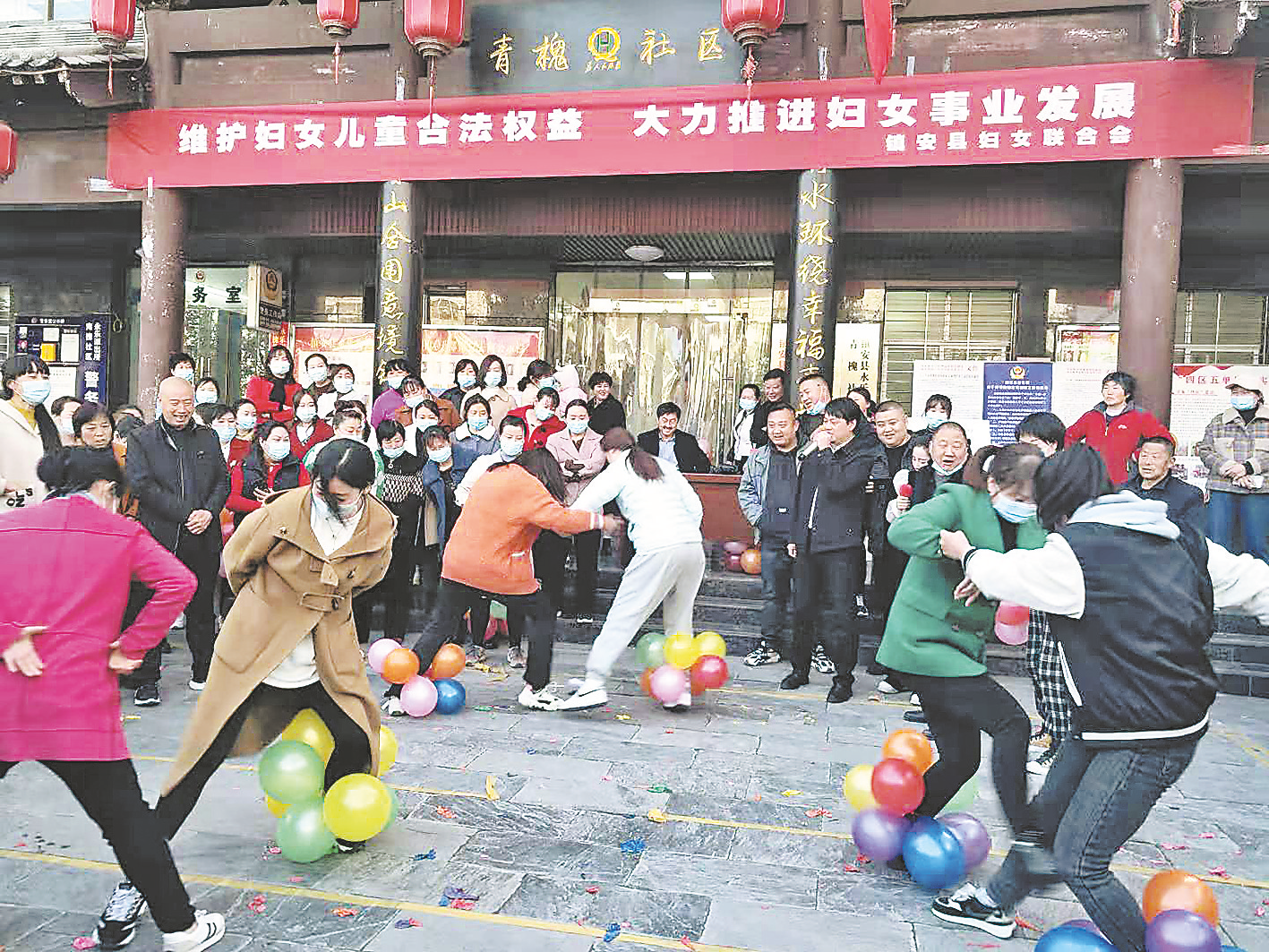 ?、?月7日,鎮(zhèn)安縣永樂街辦青槐社區(qū)舉行“相約‘三八’、樂在社區(qū)”趣味運動會,具有農(nóng)耕農(nóng)趣農(nóng)味的踩氣球、搶座位、運送乒乓球、拔河等比賽活動,受到了社區(qū)女干部和群眾的歡迎。(侯欽彬 攝)