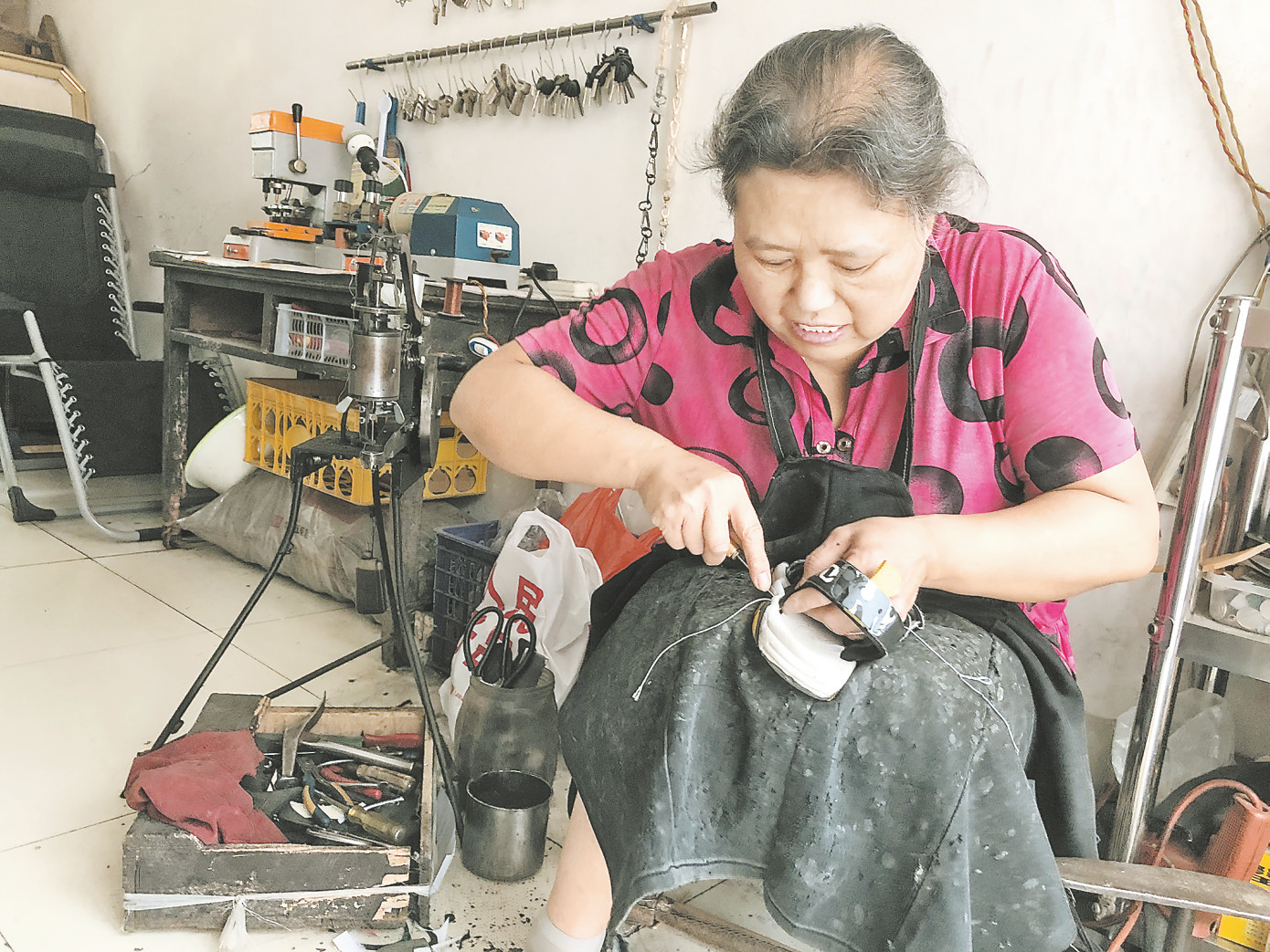 今年50歲的王敏是東街社區(qū)人,年輕時(shí),她打過零工,也和丈夫在城區(qū)跑過“蹦蹦車”,后來城區(qū)車輛整治,取締了“蹦蹦車”拉人,再加上丈夫身體不好,他們就放棄了跑車。就在她四處尋找商機(jī)時(shí),婆婆鼓勵(lì)她學(xué)手藝擺攤子修鞋。“說實(shí)話,剛開始還抹不下臉,覺得坐在街道邊給人修鞋沒出息。”說起13年前決定干修鞋,王敏說是因?yàn)槠牌诺膭駥?dǎo),讓她徹底放下了顧慮,她也想明白了,修鞋是一個(gè)謀生的手段,只要活做得好,做人誠信善良,就會(huì)有收獲。