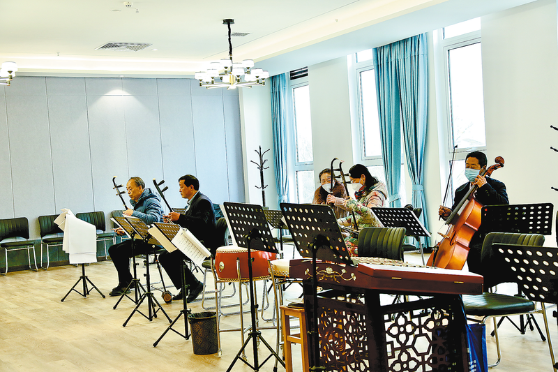在金山康養(yǎng)城休閑娛樂中心,老人們自發(fā)組織樂團排練樂曲。