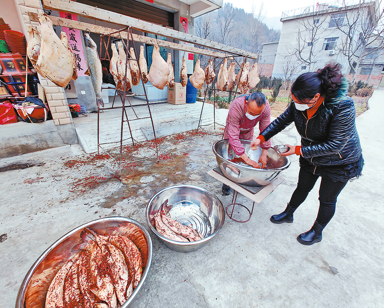 張全東介紹,春節(jié)前他家露臺上、院子里到處掛滿臘肉,有熏制的、有自然風干的,有麻辣的、有五香的,做法不同,口感風味也不一樣,傳統(tǒng)的農(nóng)家臘肉已經(jīng)被他開發(fā)成了不同的特色產(chǎn)品。春節(jié)前后,臘肉成為供不應求的特色年貨,最多的時候一天他要向西安運送3貨車的臘味,價值20多萬元。