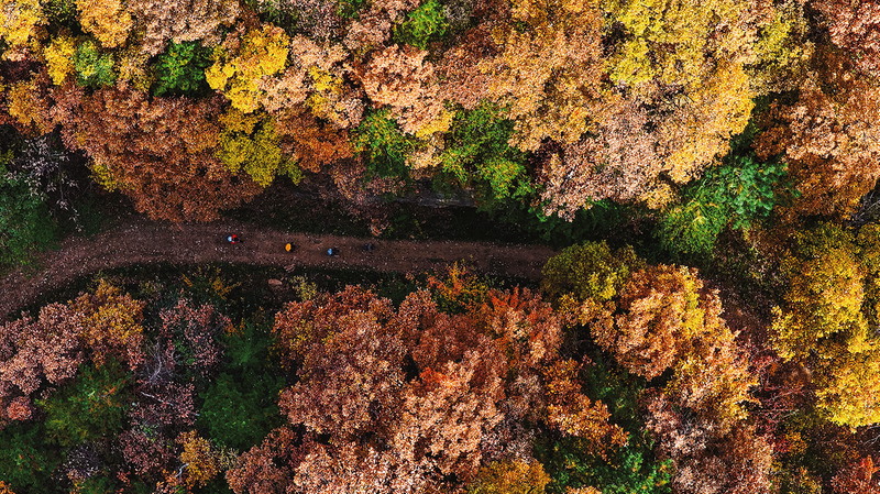 △俯瞰老林溝,樹上各色葉子交織在一起,如同一幅五彩斑斕的畫。