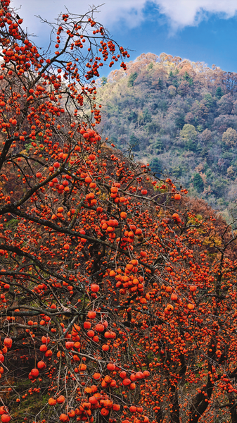 △在商州區(qū)楊斜鎮(zhèn),火紅的柿子掛滿枝頭,在遠(yuǎn)山的映襯下構(gòu)成秋天山村最美的風(fēng)景。