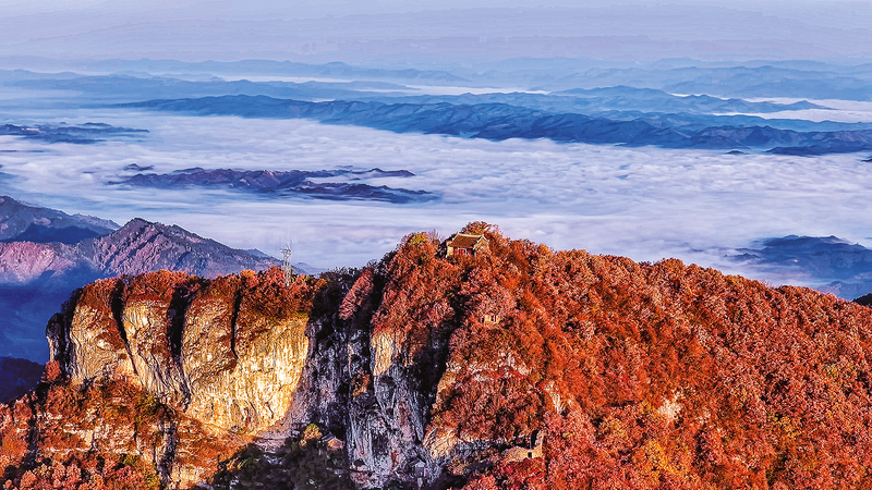 △位于洛南縣高耀鎮(zhèn)的文顯山林木茂密。深秋時節(jié),滿山紅葉色彩濃烈,襯托得山間流動的云海更為壯觀。