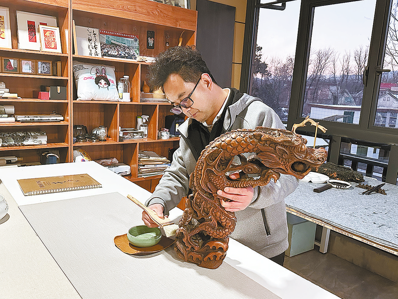 唐曌堃對(duì)作品《龍騰盛世》進(jìn)行擦油保養(yǎng)。