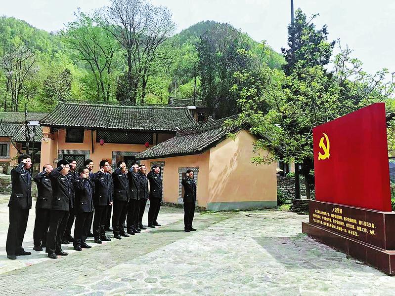4月16日,商州監(jiān)獄黨員干部在丹鳳縣龍駒寨街辦馬爐村開展黨史學(xué)習(xí)教育活動(dòng)。黨員們面向黨旗,重溫入黨誓詞。(朱浩楠 攝)