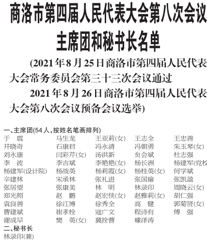 本報訊(記者 余婷)8月26日下午,商洛市第四屆人民代表大會第八次會議主席團舉行第二次會議。大會主席團常務(wù)主席張凱盈主持會議,主席團其他成員出席會議。 會議應(yīng)到54人,出席53人,出席人數(shù)符合法定人數(shù)?!?..