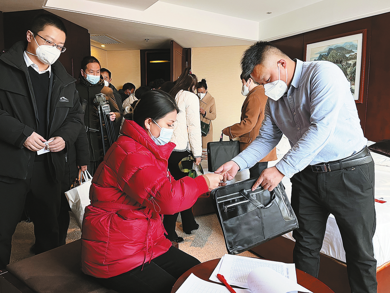 ①1月31日,參加市第五屆人民代表大會第三次會議的代表們陸續(xù)趕到駐地酒店報到,在登記、領取資料后,代表們就大會議程和各自帶來的議題互相交流,從對口幫扶、鄉(xiāng)村振興到養(yǎng)老、教育、醫(yī)療,代表們關切的議題涉及經(jīng)濟社會發(fā)展的方方面面,他們將帶著群眾的心聲和發(fā)展的建議,在接下來的幾天時間里,就推動商洛高質(zhì)量發(fā)展積極建言獻策、履職盡責。 (本報記者 謝 非 攝)