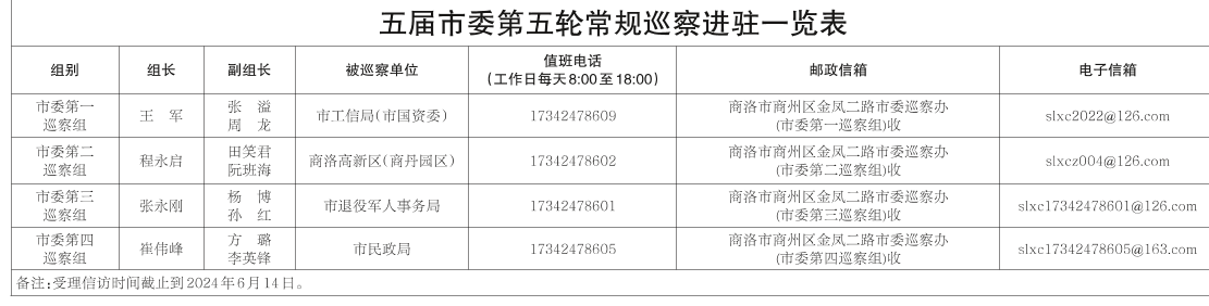 據(jù)悉,市委4個(gè)巡察組將在被巡察單位工作20天左右,巡察期間設(shè)立專門值班電話、郵政信箱和電子信箱等,主要受理反映被巡察單位領(lǐng)導(dǎo)班子及其成員、本單位本機(jī)關(guān)其他市管領(lǐng)導(dǎo)干部、重要崗位黨員干部和下一級(jí)單位主要負(fù)責(zé)人(含近3年退休、調(diào)離干部)問題的來信來電來訪,重點(diǎn)是違反政治紀(jì)律、組織紀(jì)律、廉潔紀(jì)律、群眾紀(jì)律、工作紀(jì)律、生活紀(jì)律方面的情況舉報(bào)和問題反映。其他不屬于巡察受理范圍的信訪問題,將按規(guī)定交由被巡察單位和有關(guān)部門處理。巡察組受理來電時(shí)間為工作日8:00—18:00,受理信訪時(shí)間截止到2024年6月14日。