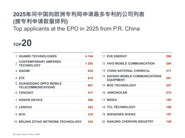 中國領(lǐng)軍企業(yè)表現(xiàn):首次兩家中國企業(yè)躋身EPO企業(yè)申請(qǐng)榜前十