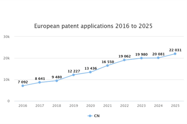 • 2025年,歐洲專利局受理來自中國的專利申請(qǐng)達(dá)22,031件,較2024年增長9.7%