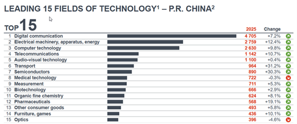 在核心領(lǐng)域之外,2025年中國在其他技術(shù)領(lǐng)域也展現(xiàn)出強(qiáng)勁增長。交通運(yùn)輸領(lǐng)域的申請(qǐng)量大幅增長31.2%,半導(dǎo)體領(lǐng)域增長30.3%,增速均領(lǐng)跑其他主要國家及地區(qū)。與此同時(shí),生物技術(shù)(增長2.9%)和有機(jī)精細(xì)化學(xué)(增長8.1%)穩(wěn)步增長,反映出中國創(chuàng)新布局正趨于多元化。