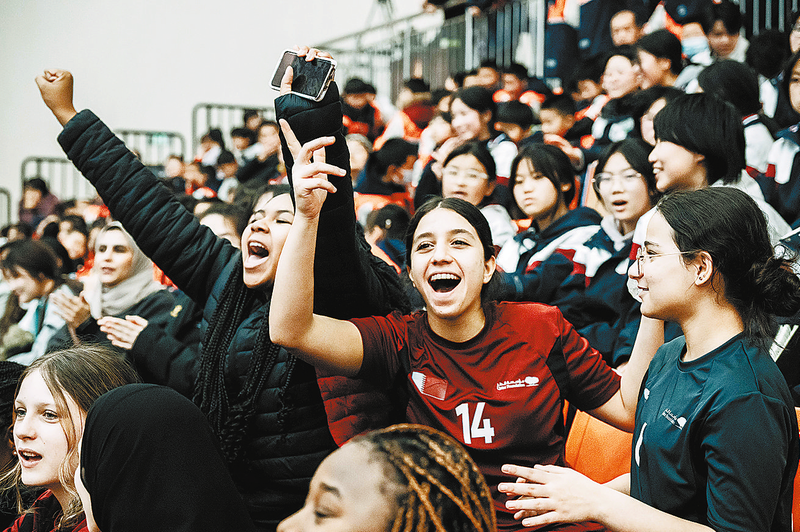 ?、?2月11日,看臺上,觀賽隊伍為場上球員的出色表現(xiàn)吶喊喝彩。