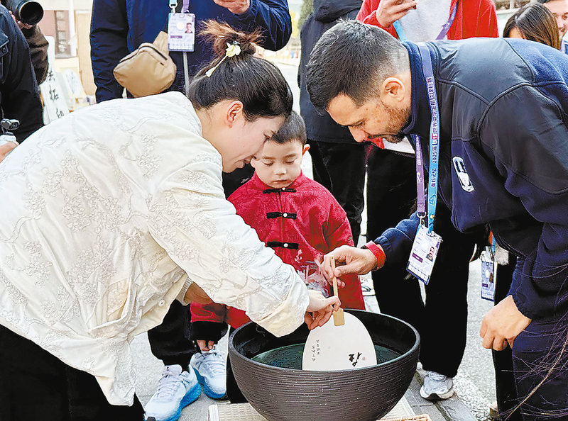 ?、?2月9日,文化交流日當(dāng)天,各國運動員走進我市六所學(xué)校感受中國文化和體育發(fā)展的蓬勃活力。圖為球員在商州區(qū)六小感受中國書法和書畫的魅力。