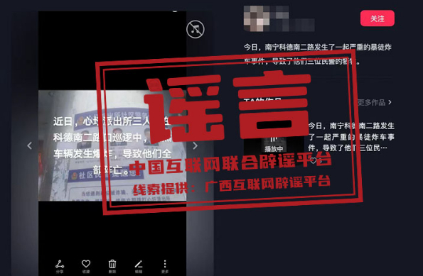 真相:近期,有網(wǎng)民在短視頻平臺(tái)上發(fā)布視頻稱“某派出所三人在路口巡邏中,突然車輛發(fā)生爆炸,導(dǎo)致三位民警全部犧牲”。經(jīng)南寧公安部門(mén)調(diào)查,該信息為謠言。網(wǎng)民韋某為吸引關(guān)注,杜撰此條謠言信息,并利用手機(jī)進(jìn)行發(fā)布。根據(jù)《中華人民共和國(guó)治安管理處罰法》第二十五條,屬地公安機(jī)關(guān)已依法對(duì)韋某處以行政處罰。(來(lái)源:廣西互聯(lián)網(wǎng)辟謠平臺(tái)、南寧網(wǎng)警)