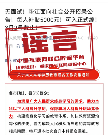真相:近日,“墊江招聘信息網(wǎng)”微信公眾號(hào)發(fā)布信息:“無(wú)面試!重慶墊江面向社會(huì)公開招錄公告!每人補(bǔ)貼5000元!可入正式編!”部分網(wǎng)民看到該信息后誤認(rèn)為,墊江面向社會(huì)以補(bǔ)貼形式招錄具有正式編制的公務(wù)人員,于是紛紛向墊江縣有關(guān)部門致電咨詢招錄情況。經(jīng)核實(shí),近年來(lái),墊江未曾以補(bǔ)貼方式和不經(jīng)過(guò)面試招錄具有正式編制公務(wù)人員。該信息實(shí)則為成人學(xué)歷提升培訓(xùn)信息,而非正式編制公務(wù)人員招錄信息。墊江縣互聯(lián)網(wǎng)信息辦公室已依法對(duì)發(fā)布該信息的微信公眾號(hào)負(fù)責(zé)人進(jìn)行約談和教育批評(píng),指出虛假信息的危害性,并責(zé)令刪除相關(guān)信息。(來(lái)源:重慶辟謠)