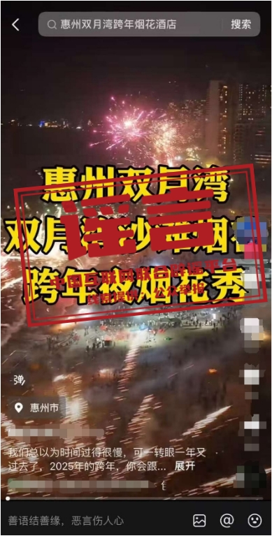 真相:近期,網(wǎng)絡(luò)上出現(xiàn) “廣東惠州雙月灣2025跨年煙花秀”“2025雙月灣跨年倒數(shù)夜”“雙月灣跨年煙花秀”等信息,引發(fā)關(guān)注。經(jīng)相關(guān)部門核實,網(wǎng)傳信息均系不實信息。目前廣東省惠州市惠東縣雙月灣沒有舉辦2025年跨年煙花秀活動的安排,請廣大游客不聽謠、不信謠、不傳謠,一切以官方發(fā)布信息為準(zhǔn)。(來源:“惠州日報”微信公眾號、惠東文旅體)