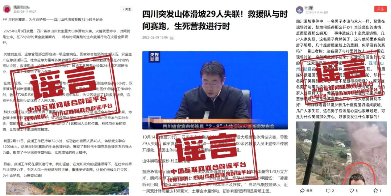 詳情:2025年2月8日,四川宜賓筠連發(fā)生山體滑坡已造成1人遇難、28人失聯(lián),2人受傷。全民救援關(guān)鍵時刻,部分網(wǎng)民為吸引流量博取關(guān)注,在網(wǎng)上捏造不實信息、散布災(zāi)情謠言、混淆大眾視聽,不僅擾亂了社會公共秩序,更對救援工作造成困擾。