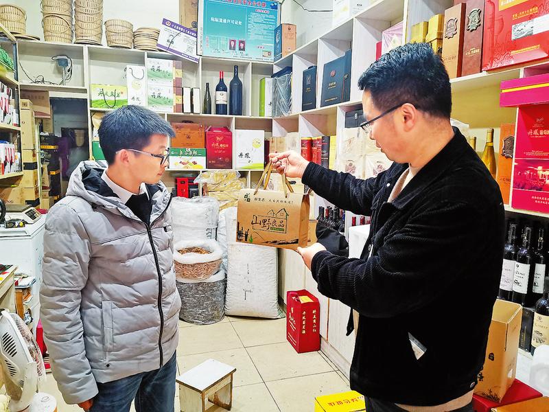 近日,來到位于丹鳳縣城車站路附近一個(gè)名叫山野良品的門店前時(shí),劉瑞生正在幫顧客將一袋50斤重的香菇抬到街對(duì)面的貨車上。經(jīng)詢問,這名顧客是丹鳳供銷社的采購(gòu)者,這次是專程過來批發(fā)香菇的。走進(jìn)這家小小土特產(chǎn)專賣店,各式各樣的土特產(chǎn)應(yīng)有盡有。“這個(gè)核桃雖然外形看著不好看,但是里面的果仁很飽滿,這是土雞蛋,綠色的那個(gè)是烏雞下的蛋……”丹鳳“靠譜貿(mào)易”公司經(jīng)理劉瑞生一樣一樣向筆者介紹著。除了丹鳳供銷社、商州山地八大件,丹鳳很多電商平臺(tái)也從劉瑞生這里批發(fā)土特產(chǎn)。