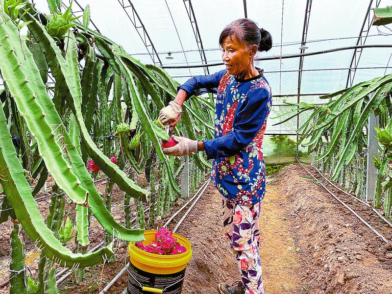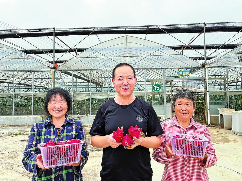 除了火龍果,李剛還引進(jìn)了新品李梅、紅梨、大櫻桃、瑞雪蘋果、圣女果等多種特色水果。在大棚與大棚之間的空地里,他又種上了紅薯、小香薯等。2020年,李剛注冊(cè)了“江紅她園”商標(biāo),使得基地的水雜果走向品牌化。他認(rèn)為,將市場(chǎng)需求與合作社效益增長(zhǎng)相結(jié)合,注重“綠色化、立體化”發(fā)展,一定可以走出一條農(nóng)民致富的新途徑。