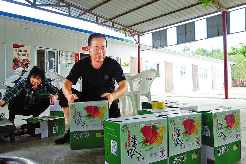 秋風(fēng)送爽,瓜果飄香。8月19日,丹鳳縣棣花鎮(zhèn)萬(wàn)灣社區(qū)利民農(nóng)民專業(yè)合作社內(nèi),負(fù)責(zé)人李剛和工人正在將剛剛采摘的火龍果稱重裝箱。火龍果大棚內(nèi),顏色鮮艷、碩大飽滿的火龍果掛滿枝頭,長(zhǎng)勢(shì)喜人。目前正是利民農(nóng)民專業(yè)合作社火龍果的豐果期,每天訂購(gòu)該基地火龍果的客商絡(luò)繹不絕。