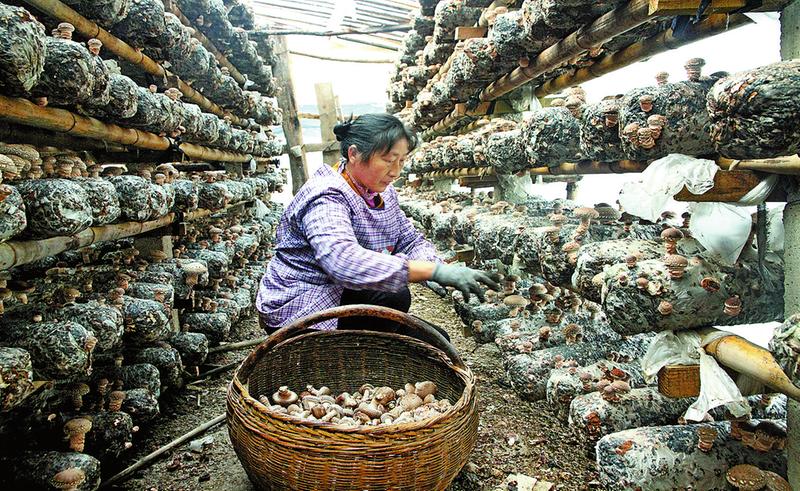 在桑樹(shù)村的香菇種植基地里,村民們正在忙著采摘、搬運(yùn)香菇。在村民潘紅英家的香菇棚里,只見(jiàn)她麻利地把菌棒上一個(gè)個(gè)肥厚的香菇摘入籃中,不一會(huì)兒就摘了一籃子。